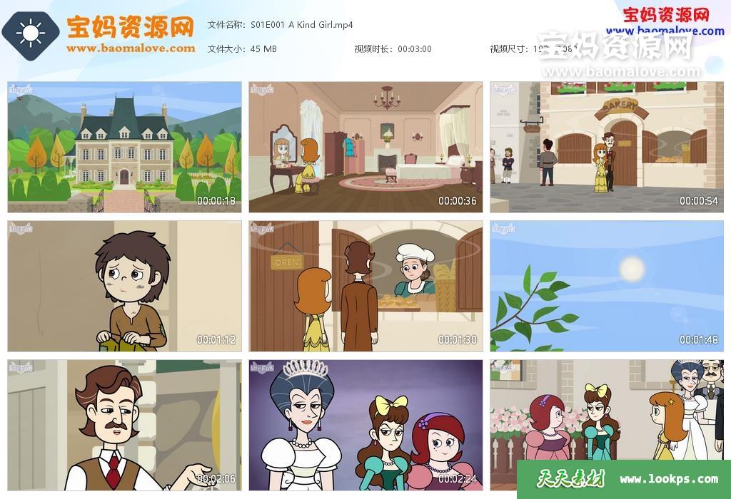 天天资源网收录的动画片《Cinderella》灰姑娘英文版,全部12集,英语发音,外挂英文字幕(可下载后使用播放器选择设置字幕或者关闭字幕);每集大小约45M,资源总大小573M,单集播放时长约3分钟,1080P高清MP4格式,可以在电视机或电脑、平板、IPAD、早教机、手机等各种设备播放,提供百度云网盘下载。