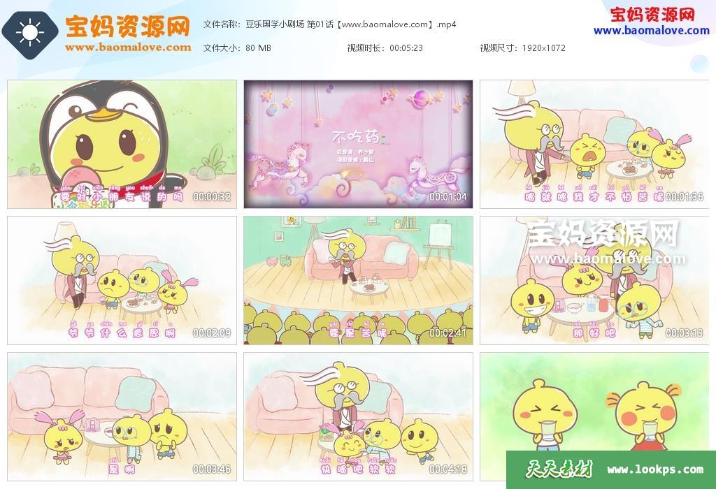 天天资源网收录的动画片《豆乐国学小剧场》,全部60集,国语发音,中文字幕;每集大小约90M,资源总大小5.4G,单集播放时长约5~9分钟,1080P高清MP4格式,可以在电视机或电脑、平板、IPAD、早教机、手机等各种设备播放,提供百度云网盘下载。