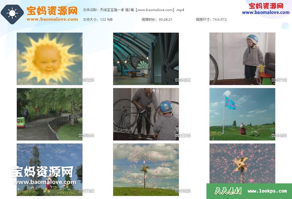 天天资源网收录的《天线宝宝》Teletubbies中文版 第一季,全部20集,国语发音,无字幕;每集大小约120M,总大小3.55G,单集播放时长约24分钟,572P标清MP4格式,可以在电视机或电脑、平板、IPAD、早教机、手机等各种设备播放,提供百度云网盘下载。