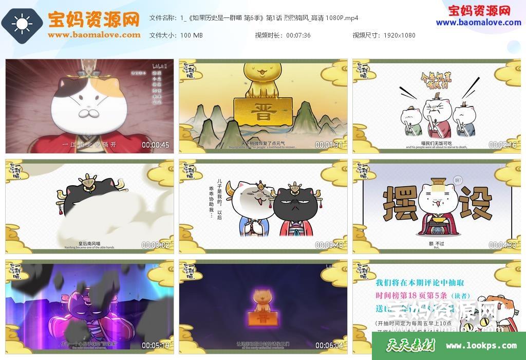 天天资源网收录的动画片《如果历史是一群喵》第1~6季,全部77集,国语发音,中文字幕;资源总大小7.29G,单集播放时长约7分钟,1080P高清MP4格式,可以在电视机或电脑、平板、IPAD、早教机、手机等各种设备播放,提供百度云网盘下载。