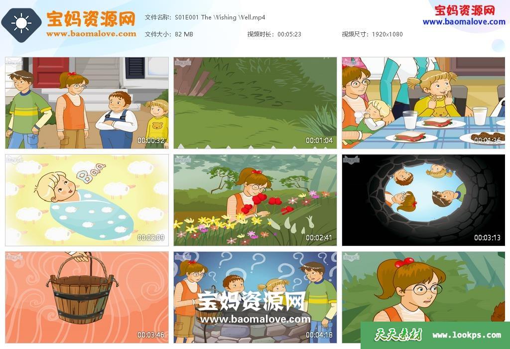 天天资源网收录的动画片《The Wishing Well》许愿井英文版,全部28集,英语发音,外挂英文字幕(可下载后使用播放器选择设置字幕或者关闭字幕);每集大小约75M,资源总大小2.06G,单集播放时长约4~5分钟,1080P高清MP4格式,可以在电视机或电脑、平板、IPAD、早教机、手机等各种设备播放,提供百度云网盘下载。