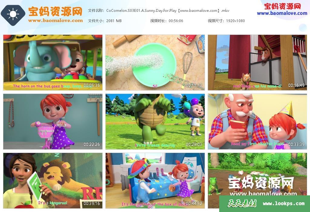 天天资源网收录的动画片《Cocomelon》可可瓜儿歌英文版 第三季,全部3集,英语发音,英文字幕;每集大小约2.3G,资源总大小6.91G,单集播放时长约60分钟,1080P高清MKV格式,可以在电视机或电脑、平板、IPAD、早教机、手机等各种设备播放,提供百度云网盘下载。