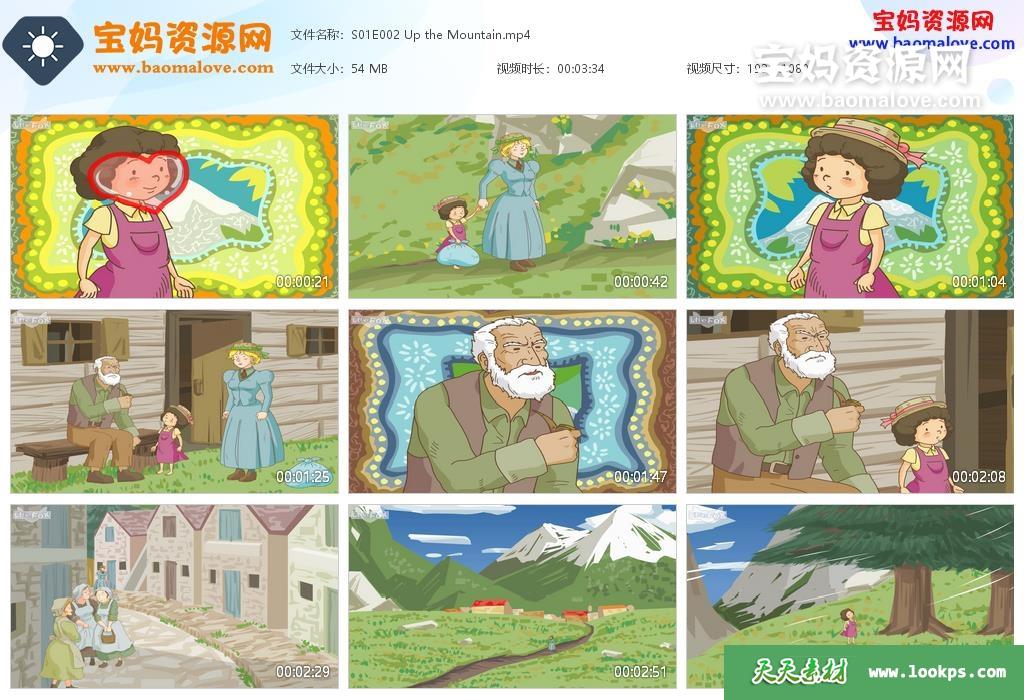 天天资源网收录的动画片《Heidi》海蒂英文版,全部26集,英语发音,外挂英文字幕(可下载后使用播放器选择设置字幕或者关闭字幕);每集大小约60M,资源总大小1.66G,单集播放时长约3~5分钟,1080P高清MP4格式,可以在电视机或电脑、平板、IPAD、早教机、手机等各种设备播放,提供百度云网盘下载。