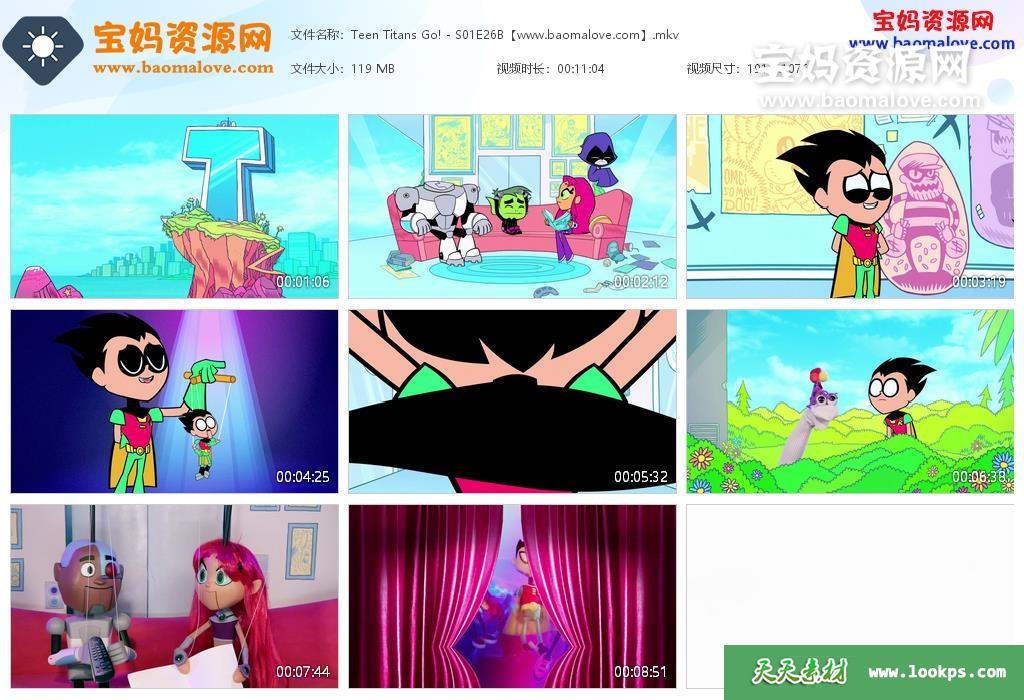 天天资源网收录的动画片《Teen Titans Go!》少年泰坦出击英文版 第一季,全部52集,英语发音,内置英文字幕(可以下载后使用播放器选择字幕或者关闭字幕);H265视频编码,资源总大小6.09G,单集播放时长约11分钟,1080P高清MKV格式,可以在电视机或电脑、平板、IPAD、早教机、手机等各种设备播放,提供百度云网盘下载。