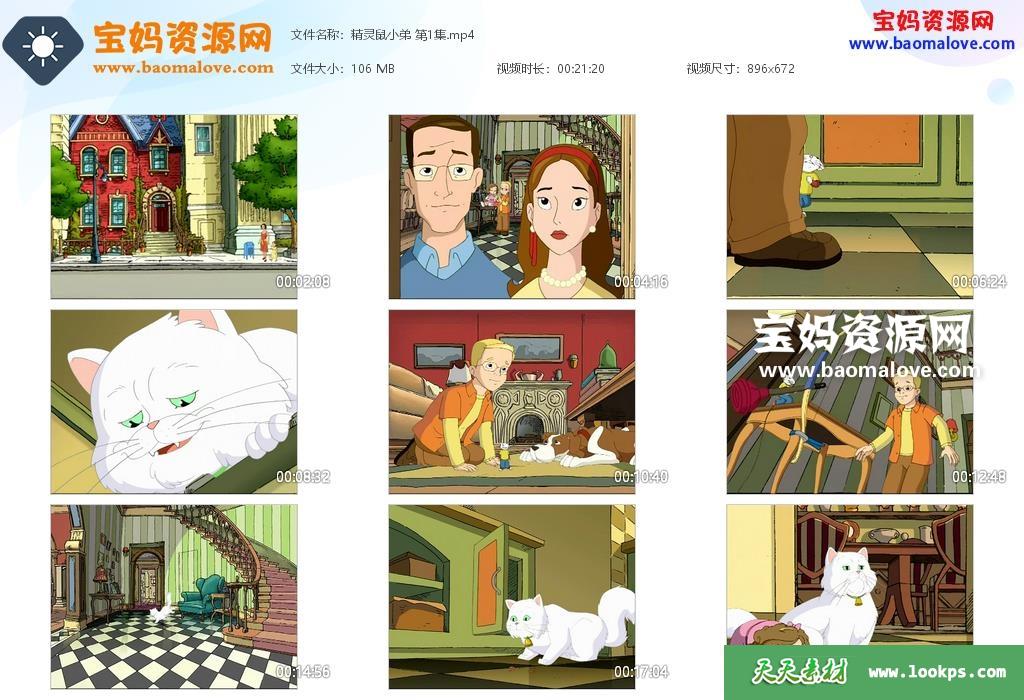 天天资源网收录的动画片《精灵鼠小弟》Stuart Little中文版 ,全部13集,国语发音,无字幕;每集大小约78M,总大小1.07G,单集播放时长约21分钟,672P标清MP4格式,可以在电视机或电脑、平板、IPAD、早教机、手机等各种设备播放,提供百度云网盘下载。