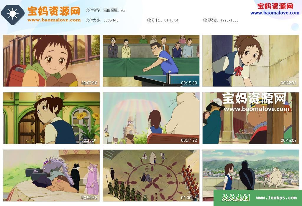 天天资源网收录的动画电影《猫的报恩》,台/粤/日/英/法/德/韩发音,中文字幕;资源大小约3.42G,1080P高清MKV格式,可以在电视机或电脑、平板、IPAD、早教机、手机等各种设备播放,提供百度云网盘下载。