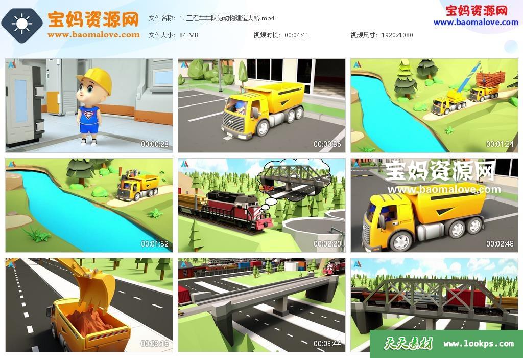 天天资源网收录的动画片《汽车世界之工程车好伙伴》第三季,全部50集,国语发音,中英文字幕;每集大小约55M,资源总大小2.85G,单集播放时长约3~4分钟,1080P高清MP4格式,可以在电视机或电脑、平板、IPAD、早教机、手机等各种设备播放,提供百度云网盘下载。