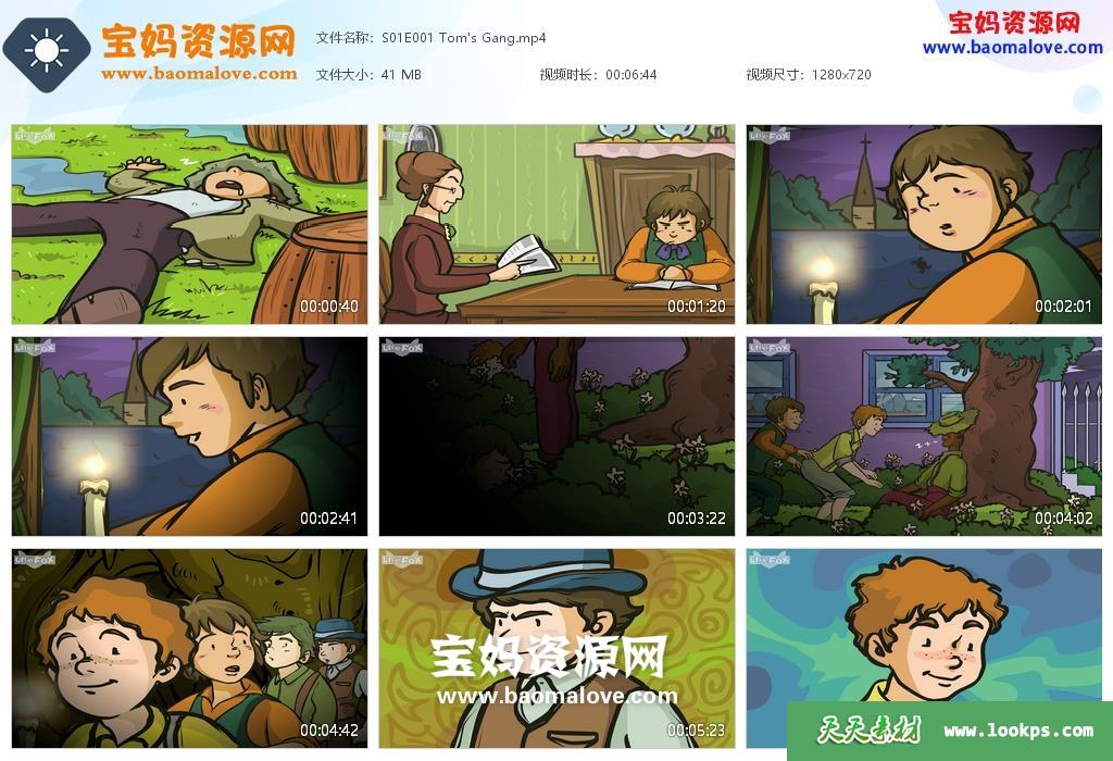 天天资源网收录的动画片《The Adventures of Huckleberry Finn》哈克贝里历险记英文版,全部25集,英语发音,外挂英文字幕(可下载后使用播放器选择设置字幕或者关闭字幕);每集大小约40M,资源总大小1.1G,单集播放时长约6~7分钟,720P高清MP4格式,可以在电视机或电脑、平板、IPAD、早教机、手机等各种设备播放,提供百度云网盘下载。