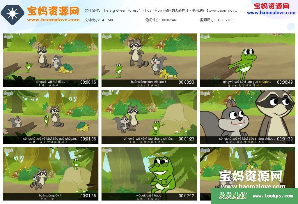 天天资源网收录的动画片《绿色的大森林》The Big Green Forest中文版,全部24集,国语发音,中文字幕;每集大小约40M,总大小1G,单集播放时长约2~3分钟,1080P高清MP4格式,可以在电视机或电脑、平板、IPAD、早教机、手机等各种设备播放,提供百度云网盘下载。