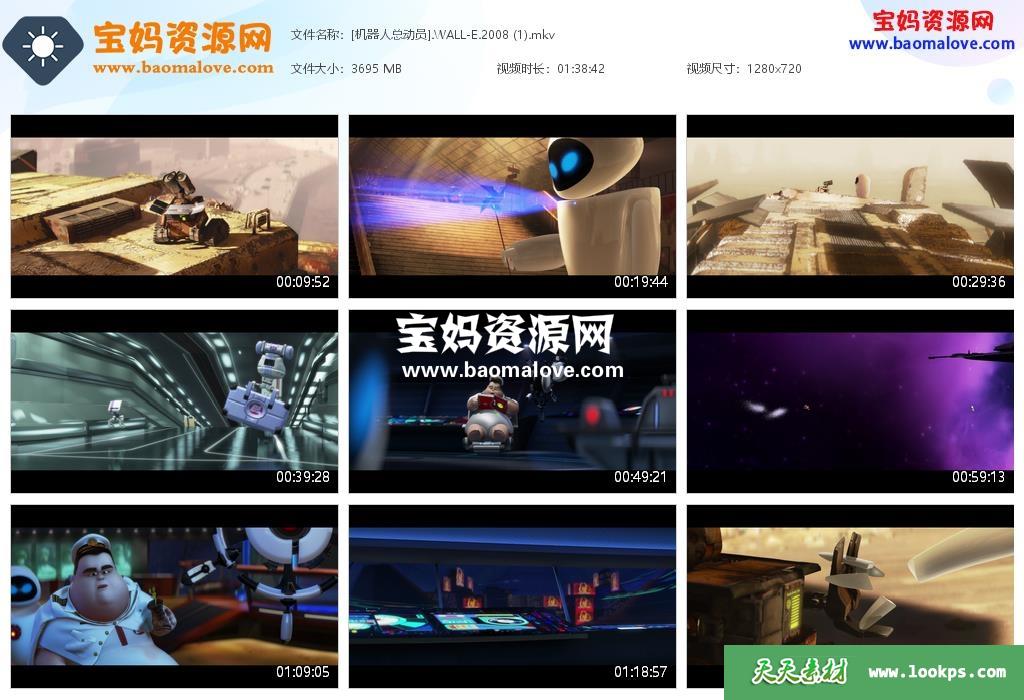 天天资源网收录的动画电影《机器人总动员 WALL·E》,国粤台英四语发音,中英文字幕;资源大小约3.6G,720P高清MKV格式,可以在电视机或电脑、平板、IPAD、早教机、手机等各种设备播放,提供百度云网盘下载。