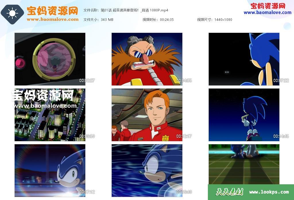 天天资源网收录的动画片《索尼克X》Sonic X中文版,全部78集,台配国语发音,无字幕;H265视频编码,每集大小约350M,资源总大小27G,单集播放时长约24分钟,1080P高清MP4格式,可以在电视机或电脑、平板、IPAD、早教机、手机等各种设备播放,提供百度云网盘下载。