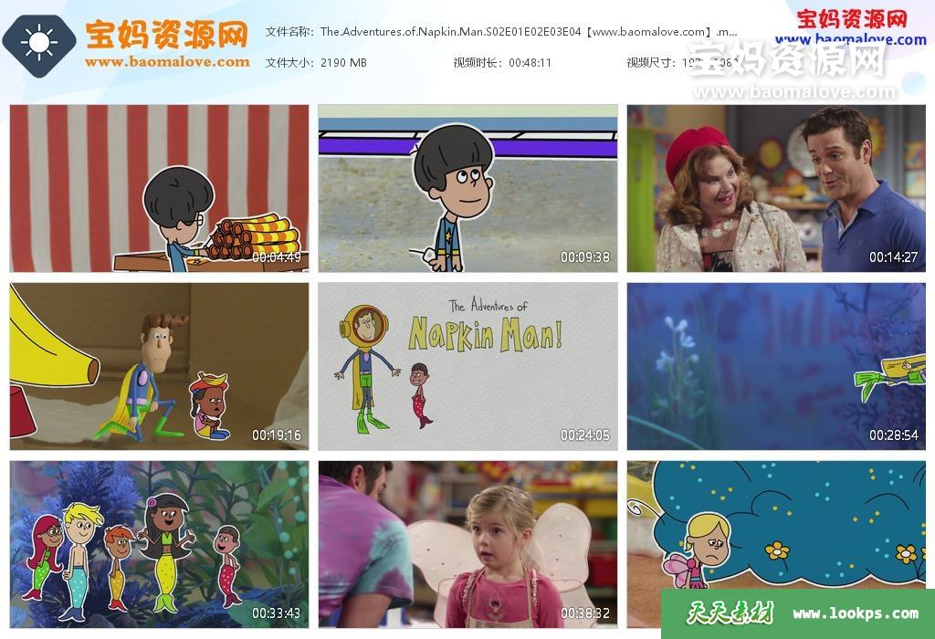 天天资源网收录的动画片《The Adventures of Napkin Man》餐巾人历险记英文版 第二季,全部20集,英语发音,内置英文字幕(可以下载后使用播放器选择字幕或者关闭字幕);资源总大小10.4G,单集播放时长约12分钟,1080P高清MKV格式,可以在电视机或电脑、平板、IPAD、早教机、手机等各种设备播放,提供百度云网盘下载。