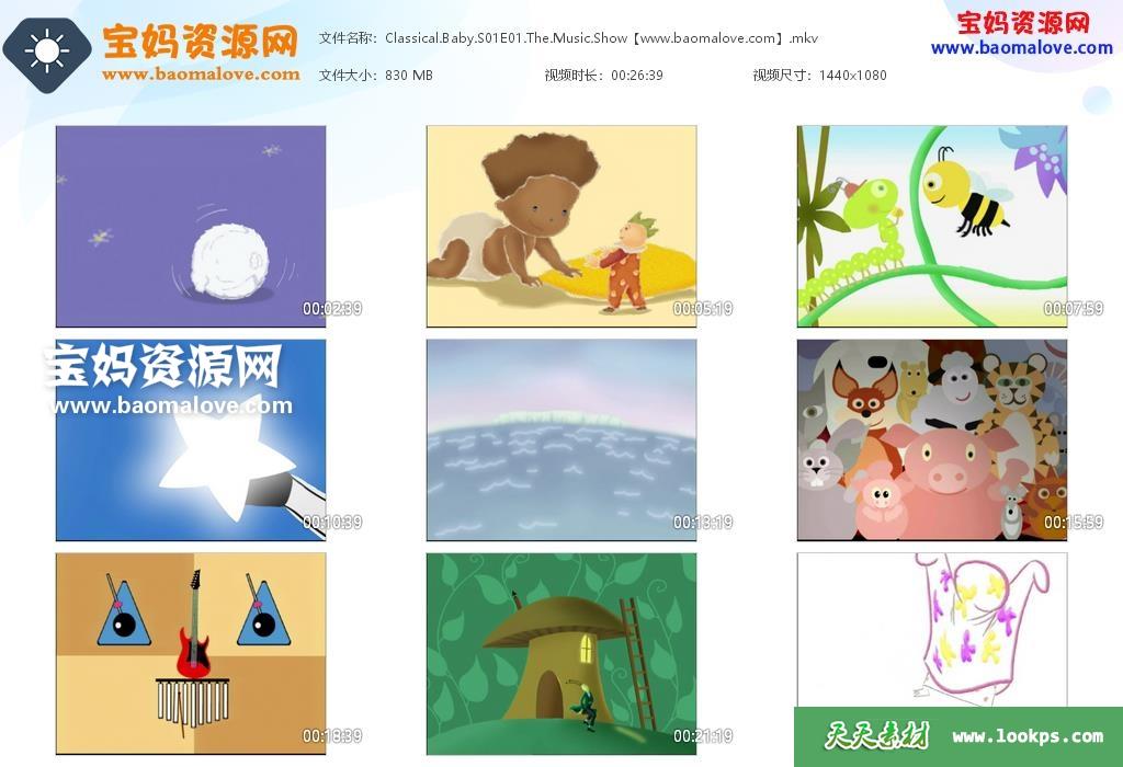 天天资源网收录的动画片《Classical Baby》古典宝宝英文版 第一季,全部4集,英语发音,内置英文字幕(可以下载后使用播放器选择字幕或者关闭字幕);每集大小860M,资源总大小3.51G,单集播放时长约26分钟,1080P高清MKV格式,可以在电视机或电脑、平板、IPAD、早教机、手机等各种设备播放,提供百度云网盘下载。
