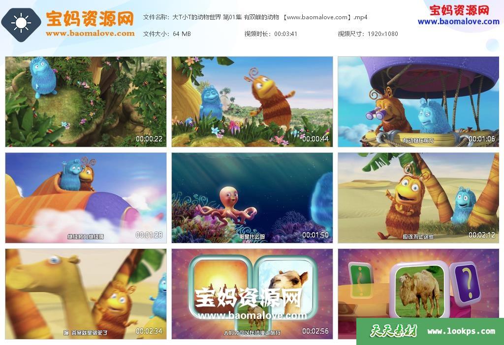 天天资源网收录的动画片《大T小T的动物世界》Trip and Troo中文版,全部52集,国语发音,中文字幕;每集大小约65M,资源总大小3.41G,单集播放时长约4分钟,1080P高清MP4视频格式,可以在电视机或电脑、平板、IPAD、早教机、手机等各种设备播放,提供百度云网盘下载。