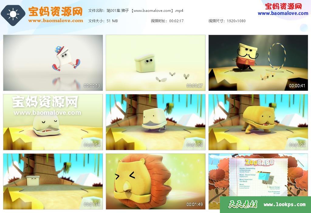 天天资源网收录的动画片《百变动物盒》Zoo Babu中文版,全部104集,国语发音,无字幕;每集大小约50M,资源总大小5.04G,单集播放时长约2分钟,1080P高清MP4视频格式,可以在电视机或电脑、平板、IPAD、早教机、手机等各种设备播放,提供百度云网盘下载。