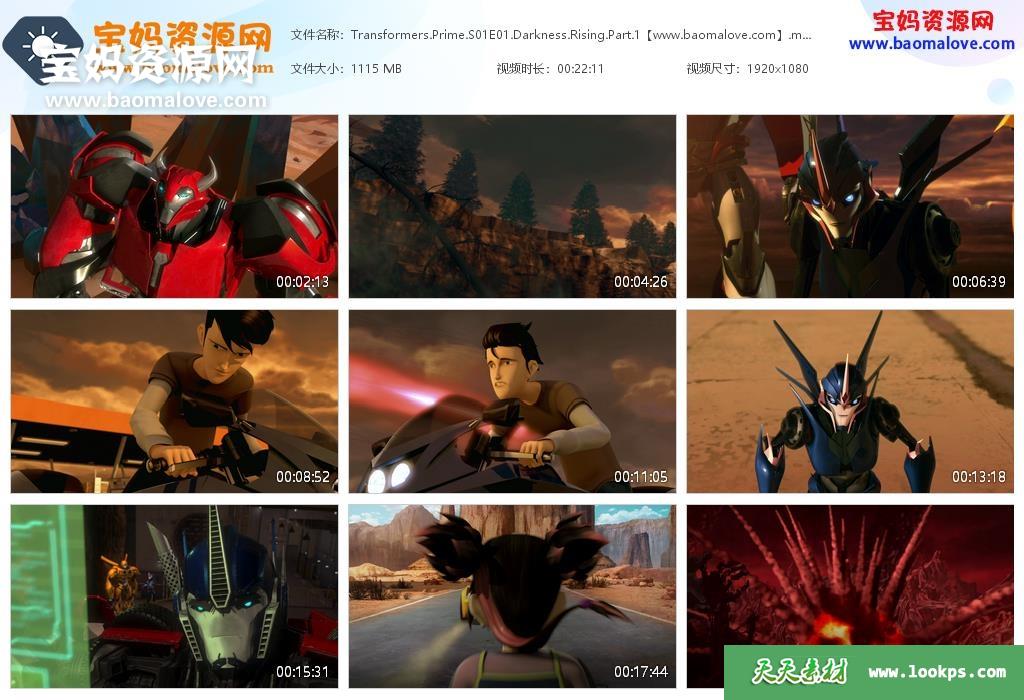 天天资源网收录的动画片《Transformers Prime》变形金刚:领袖之证英文版 第一季,全部26集,英语发音,无字幕;每集大小1.08G,资源总大小28.3G,单集播放时长约22分钟,1080P高清MP4视频格式,可以在电视机或电脑、平板、IPAD、早教机、手机等各种设备播放,提供百度云网盘下载。