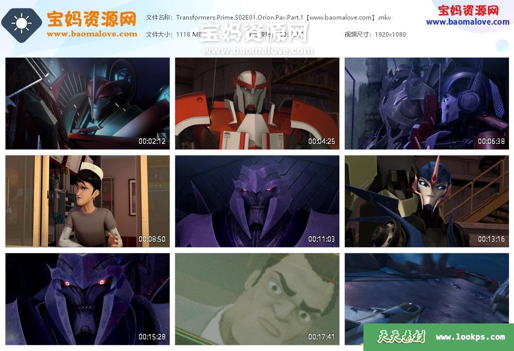 天天资源网收录的动画片《Transformers Prime》变形金刚:领袖之证英文版 第二季,全部26集,英语发音,无字幕;每集大小1.09G,资源总大小28.4G,单集播放时长约22分钟,1080P高清MP4视频格式,可以在电视机或电脑、平板、IPAD、早教机、手机等各种设备播放,提供百度云网盘下载。