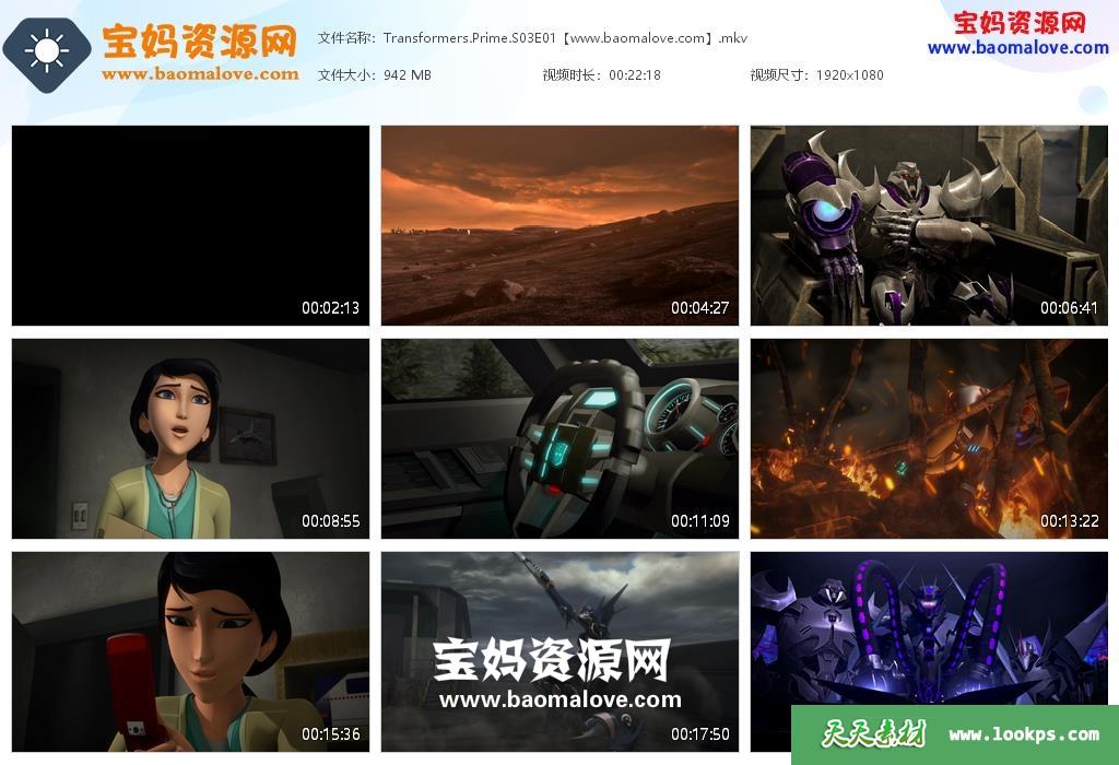 天天资源网收录的动画片《Transformers Prime》变形金刚:领袖之证英文版 第三季,全部13集,英语发音,内置英文字幕(可下载后使用播放器选择设置字幕或者关闭字幕);每集大小900M,资源总大小12.1G,单集播放时长约22分钟,1080P高清MP4视频格式,可以在电视机或电脑、平板、IPAD、早教机、手机等各种设备播放,提供百度云网盘下载。