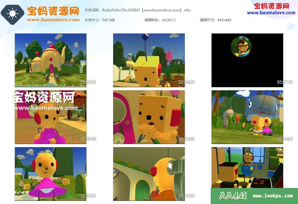 天天资源网收录的动画片《Rolie Polie Olie》小小欧里的世界英文版 第三季,全部13集,英语发音,内置英文字幕(可下载后使用播放器选择设置字幕或者关闭字幕);每集大小535M,资源总大小6.85G,单集播放时长约24分钟,480P标清MKV格式,可以在电视机或电脑、平板、IPAD、早教机、手机等各种设备播放,提供百度云网盘下载。