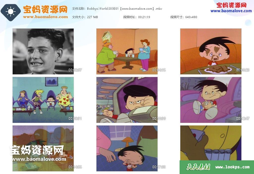 天天资源网收录的动画片《Bobby’s World》鲍比的世界英文版 第三季,全部13集,英语发音,内置英文字幕(可下载后使用播放器选择设置字幕或者关闭字幕);每集大小220M,资源总大小2.83G,单集播放时长约22分钟,480P标清MKV视频格式,可以在电视机或电脑、平板、IPAD、早教机、手机等各种设备播放,提供百度云网盘下载。