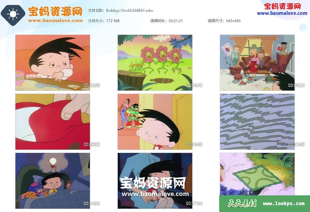 天天资源网收录的动画片《Bobby’s World》鲍比的世界英文版 第四季,全部13集,英语发音,内置英文字幕(可下载后使用播放器选择设置字幕或者关闭字幕);每集大小170M,资源总大小2.21G,单集播放时长约22分钟,480P标清MKV视频格式,可以在电视机或电脑、平板、IPAD、早教机、手机等各种设备播放,提供百度云网盘下载。