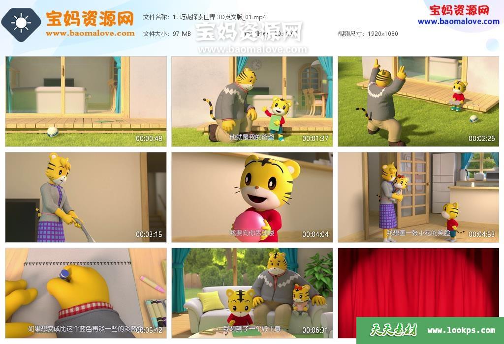 天天资源网收录的动画片《巧虎探索奇妙世界》英文版,全部40集,英语发音,中文字幕;每集大小95M,资源总大小3.77G,单集播放时长约8分钟,1080P高清MP4视频格式,可以在电视机或电脑、平板、IPAD、早教机、手机等各种设备播放,提供百度云网盘下载。