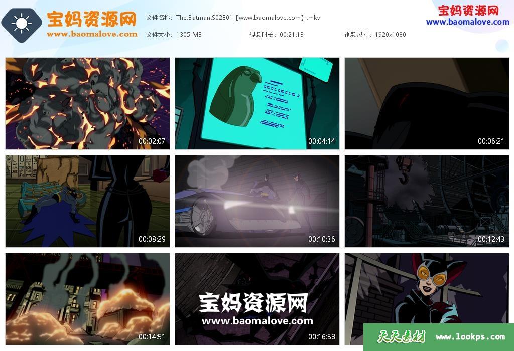 天天资源网收录的动画片《The Batman》新蝙蝠侠英文版 第二季,全部13集,英语发音,内置英文字幕(可以下载后使用播放器设置字幕字体大小颜色或者切换关闭字幕);每集大小约1.25G,资源总大小16.3G,单集播放时长约21分钟,1080P高清MKV视频格式,可以在电视机或电脑、平板、IPAD、早教机、手机等各种设备播放,提供百度网盘下载。