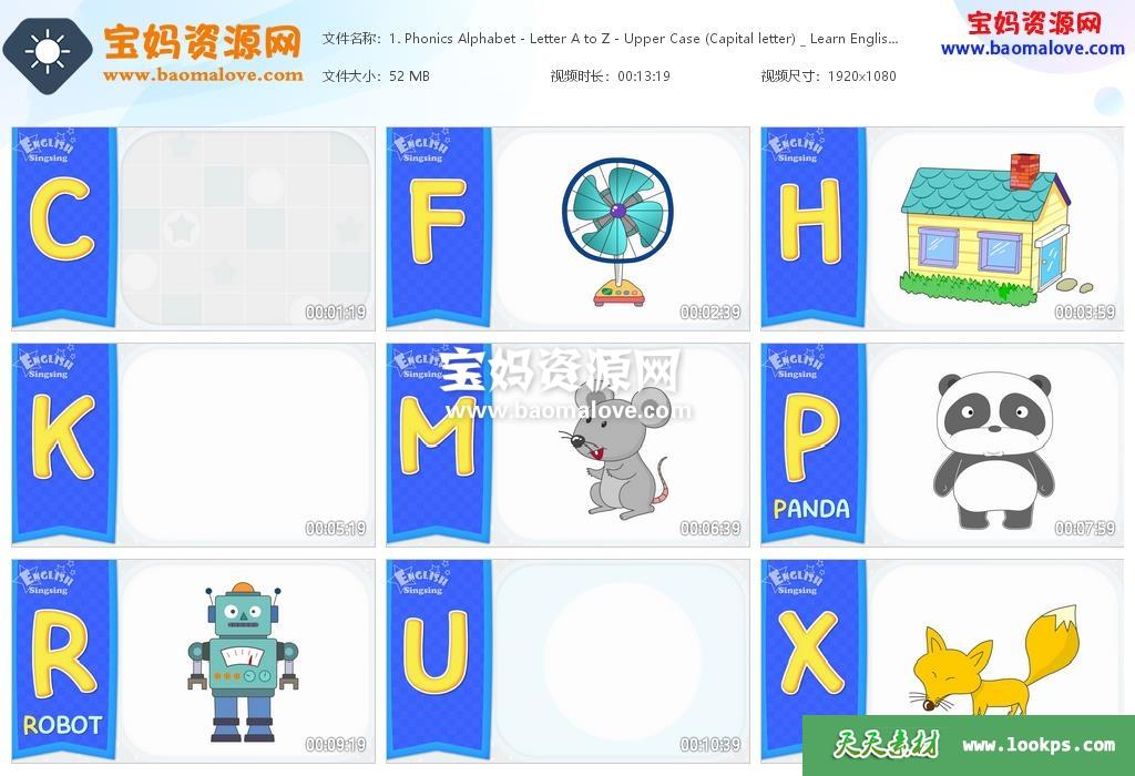 天天资源网收录的动画片《Phonics | Learn English A to Z》,全部43集,英语发音,英文字幕;资源总大小489M,单集播放时长约1~13分钟,1080P高清MP4格式,可以在电视机或电脑、平板、IPAD、早教机、手机等各种设备播放,提供百度云网盘下载。
