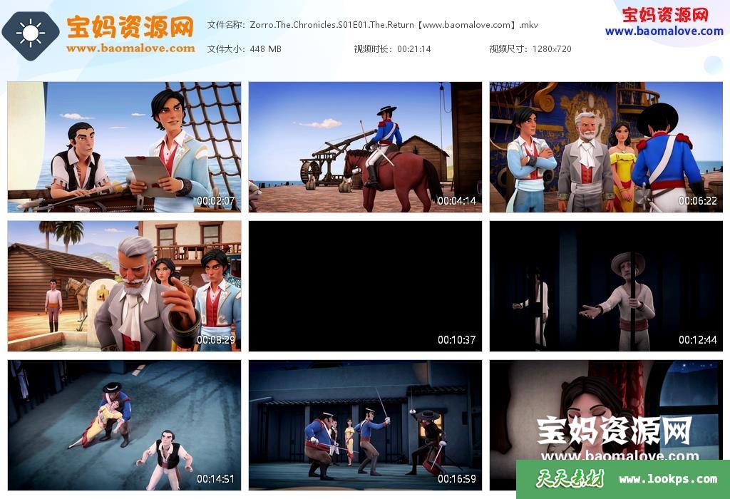 天天资源网收录的动画片《Zorro The Chronicles》少年佐罗:英雄诞生记英文版,全部26集,英语发音,内置英文字幕(可以下载后使用播放器设置字幕字体大小颜色或者切换关闭字幕);;每集大小约390M,资源总大小10.4G,单集播放时长约22分钟,720P高清MKV视频格式,可以在电视机或电脑、平板、IPAD、早教机、手机等各种设备播放,提供百度云网盘下载。