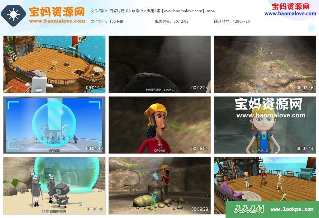 天天资源网收录的动画片《海盗的艺术冒险》Pirates: Adventures in Art中文版,全部44集,国语发音,中文字幕;每集大小约105M,资源总大小4.46G,单集播放时长约12分钟,720P高清MP4视频格式,可以在电视机或电脑、平板、IPAD、早教机、手机等各种设备播放,提供百度云网盘下载。