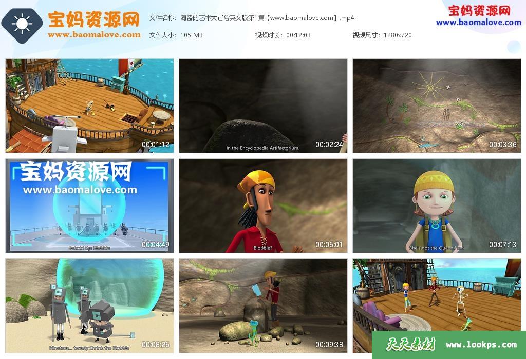 天天资源网收录的动画片《Pirates: Adventures in Art》海盗的艺术冒险英文版,全部44集,英语发音,英文字幕;每集大小约100M,资源总大小4.46G,单集播放时长约12分钟,720P高清MP4视频格式,可以在电视机或电脑、平板、IPAD、早教机、手机等各种设备播放,提供百度云网盘下载。