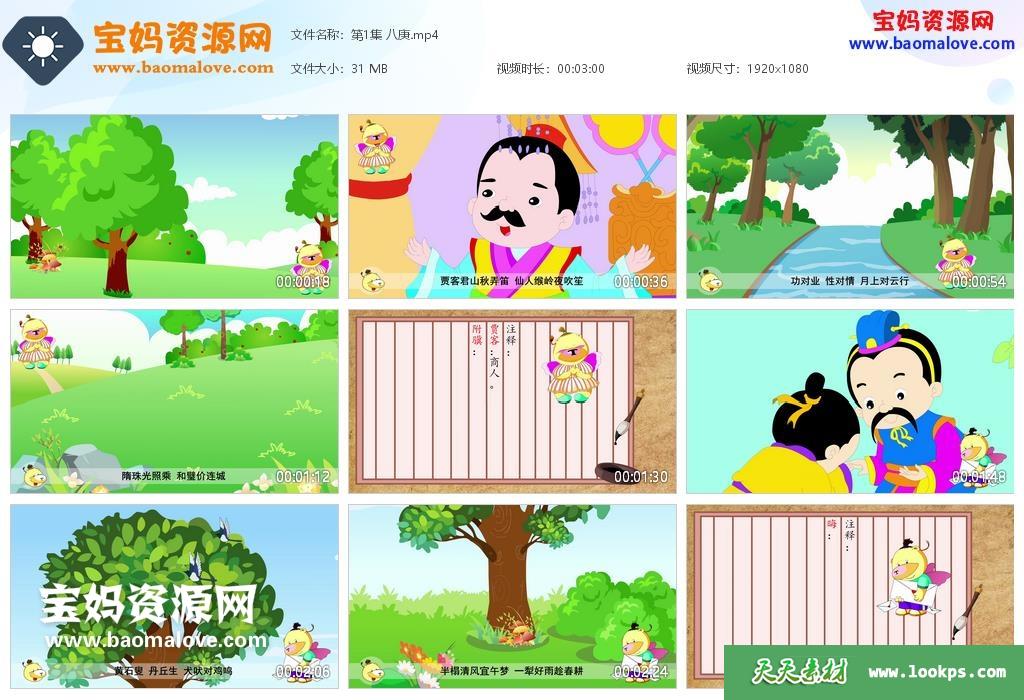 天天资源网收录的动画片《小笨熊之声律启蒙笠翁对韵》,全部60集,国语发音,中文字幕;每集大小约28M,资源总大小约1.76G,单集播放时长约3分钟,1080P高清MP4视频格式,可以在电视机或电脑、平板、IPAD、早教机、手机等各种设备播放,提供百度云网盘下载。