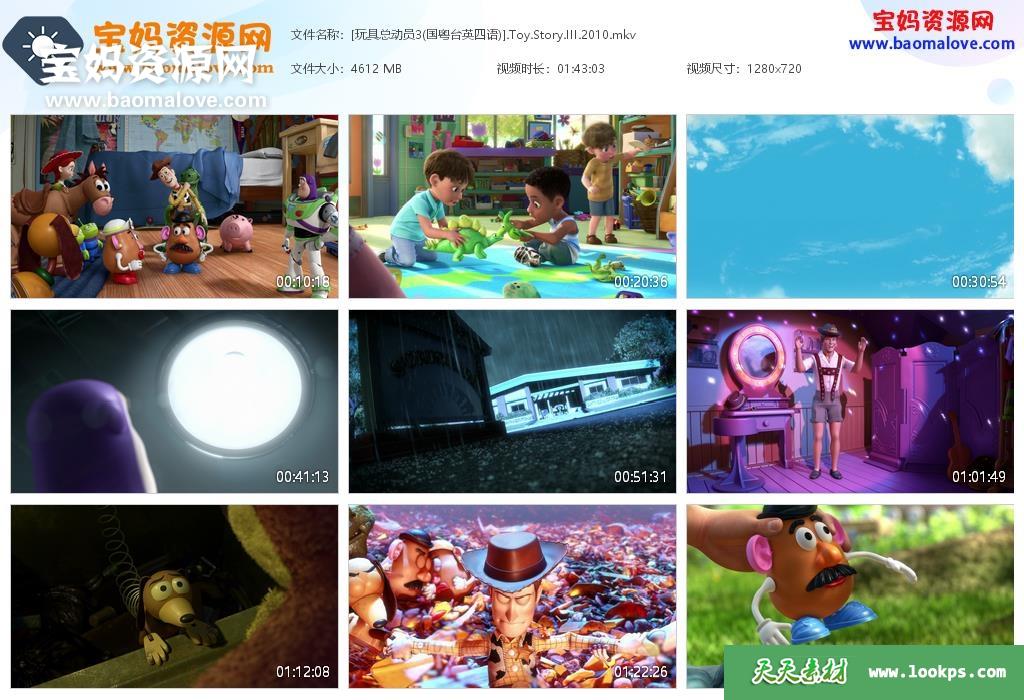 天天资源网收录的动画电影《玩具总动员3 Toy Story 3》,国粤台英四语发音,内置中英文字幕(可以下载后使用播放器选择设置字幕或者关闭字幕);资源大小约4.5G,720P高清MKV视频格式,可以在电视机或电脑、平板、IPAD、早教机、手机等各种设备播放,提供百度云网盘下载。