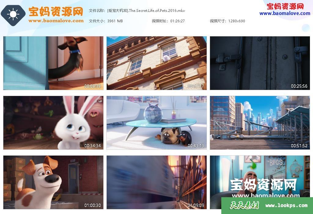 天天资源网收录的动画电影《爱宠大机密 The Secret Life of Pets》,国粤台英四语发音,内置中英文字幕(可以下载后使用播放器选择设置字幕或者关闭字幕);资源大小约3.86G,720P高清MKV视频格式,可以在电视机或电脑、平板、IPAD、早教机、手机等各种设备播放,提供百度云网盘下载。