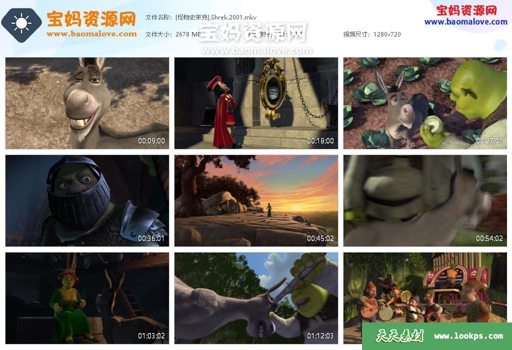 天天资源网收录的动画电影《怪物史瑞克 Shrek》,国语/粤语/英语三语发音,内置中英文字幕(可以下载后使用播放器选择设置字幕或者关闭字幕);资源大小约2.61G,720P高清MKV视频格式,可以在电视机或电脑、平板、IPAD、早教机、手机等各种设备播放,提供百度云网盘下载。