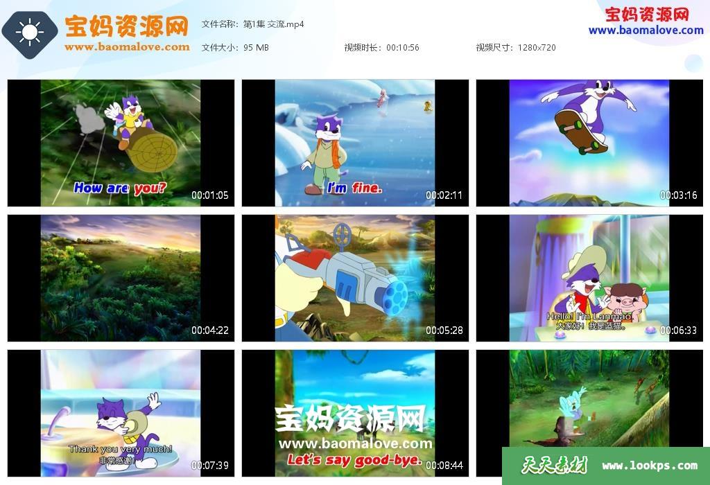 天天资源网收录的动画片《蓝猫小学英语升级版》,全部94集,英语发音,中英文字幕;每集大小约85M,资源总大小7.7G,单集播放时长约9~12分钟,720P高清MP4视频格式,可以在电视机或电脑、平板、IPAD、早教机、手机等各种设备播放,提供百度云网盘下载。