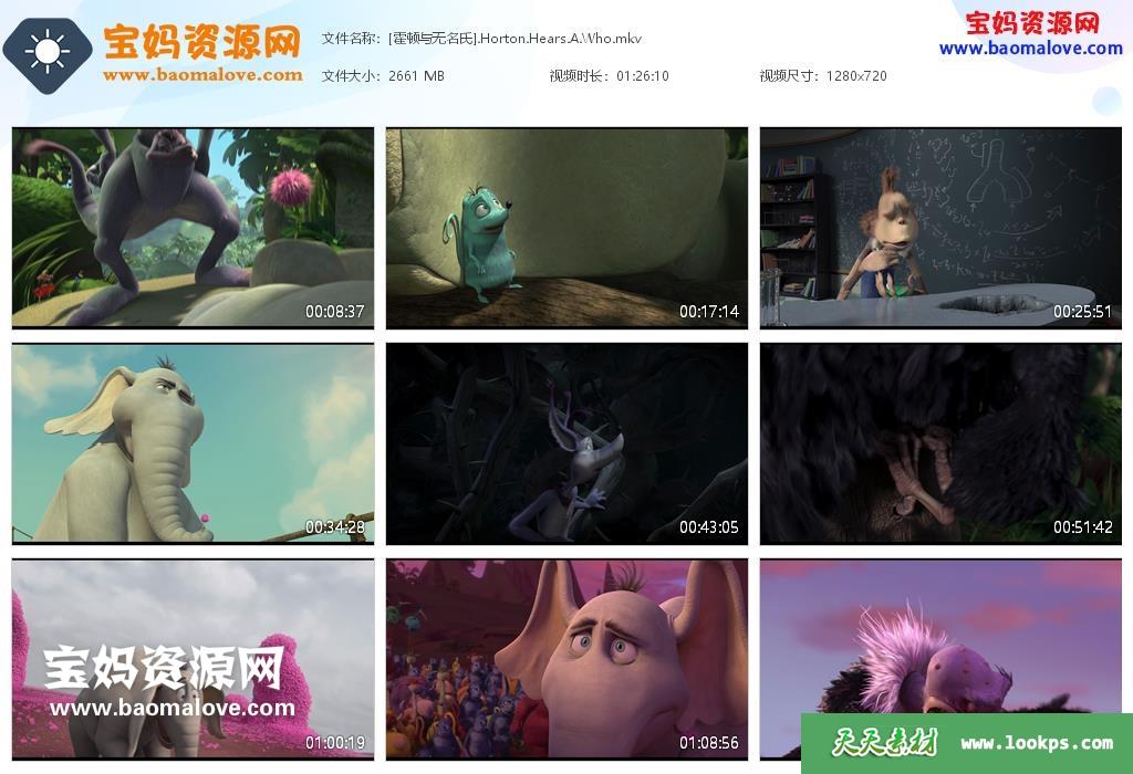 天天资源网收录的动画电影《霍顿与无名氏 Horton Hears a Who!》,国语/粤语/英语三语发音,内置中英文字幕(可以下载后使用播放器选择设置字幕或者关闭字幕);资源大小约2.58G,720P高清MKV视频格式,可以在电视机或电脑、平板、IPAD、早教机、手机等各种设备播放,提供百度云网盘下载。