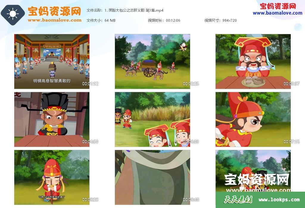 天天资源网收录的动画片《黑脸大包公之忠肝义胆》,全部42集,国语发音,中文字幕;每集大小约72M,资源总大小2.97G,单集播放时长约12分钟,720P高清MP4视频格式,可以在电视机或电脑、平板、IPAD、早教机、手机等各种设备播放,提供百度云网盘下载。