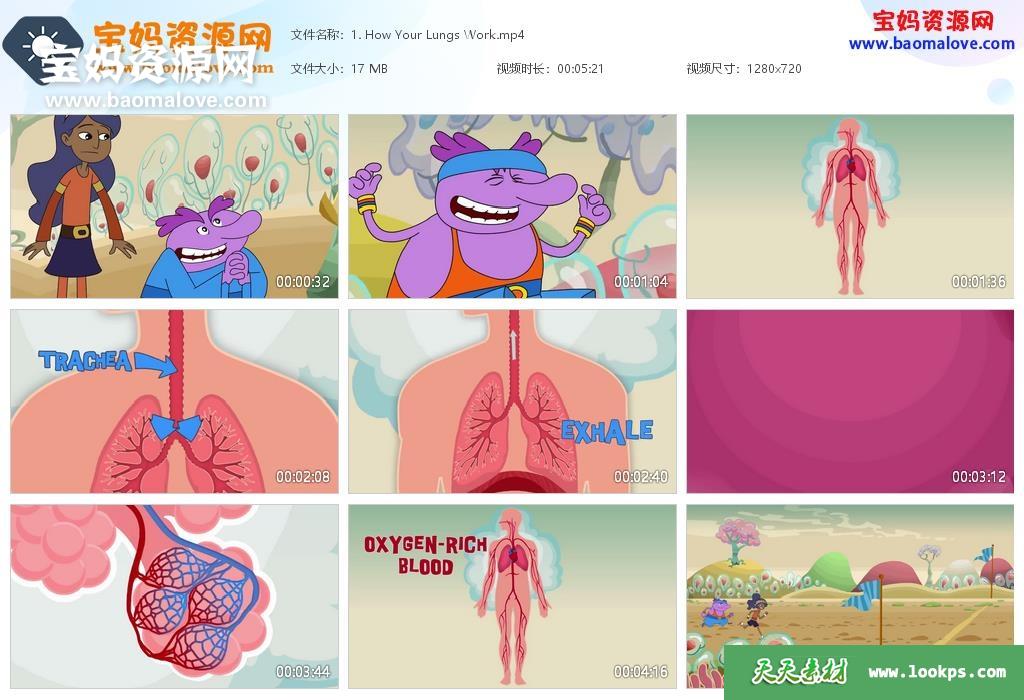 天天资源网收录的动画片《How your body works》你的身体如何工作英文版,全部18集,英语发音,外挂英文字幕;每集大小约19M,资源总大小约361M,单集播放时长约5分钟,720P高清MP4视频格式,可以在电视机或电脑、平板、IPAD、早教机、手机等各种设备播放,提供百度云网盘下载。
