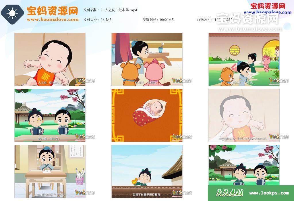 天天资源网收录的动画片《巴巴熊之三字经》,全部54集,国语发音,中文字幕;资源总大小约1.26G,单集播放时长约1~2分钟,1080P高清MP4视频格式,可以在电视机或电脑、平板、IPAD、早教机、手机等各种设备播放,提供百度云网盘下载。