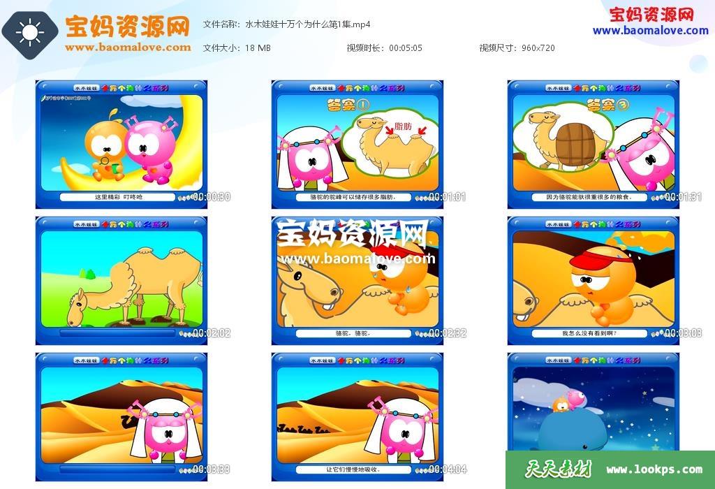 天天资源网收录的动画片《水木娃娃十万个为什么》,全部365集,国语发音,中文字幕;每集大小约25M,资源总大小9.38G,单集播放时长约5分钟,720P高清MP4视频格式,可以在电视机或电脑、平板、IPAD、早教机、手机等各种设备播放,提供百度云网盘下载。