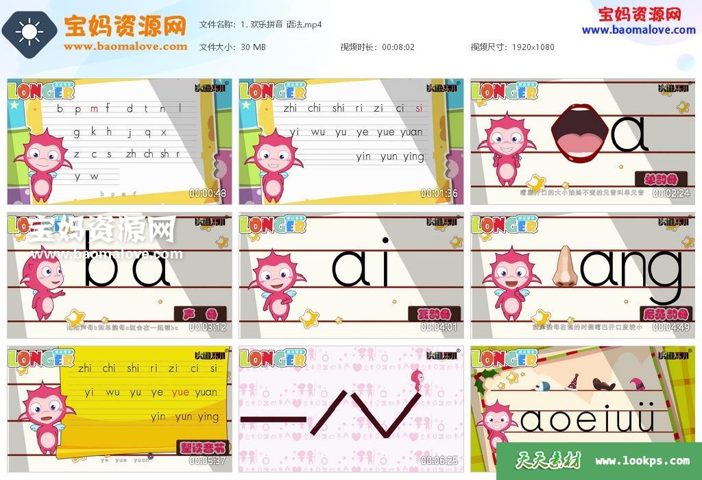 天天资源网收录的动画片《乐儿开心学字》,全部50集,国语发音,中文字幕;每集大小约20M,资源总大小约1.07G,单集播放时长约3~8分钟,1080P高清MP4视频格式,可以在电视机或电脑、平板、IPAD、早教机、手机等各种设备播放,提供百度云网盘下载。