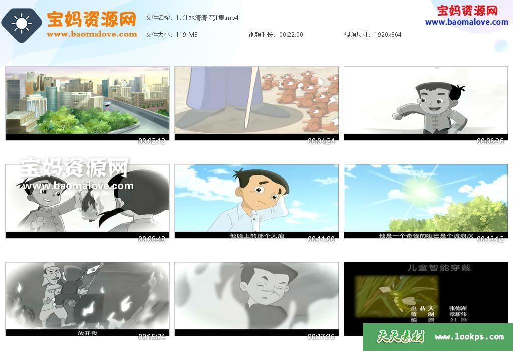 天天资源网收录的动画片《江水清清》,全部30集,国语发音,中文字幕;每集大小约116M,资源总大小约3.5G,单集播放时长约22分钟,864P高清MP4视频格式,可以在电视机或电脑、平板、IPAD、早教机、手机等各种设备播放,提供百度云网盘下载。