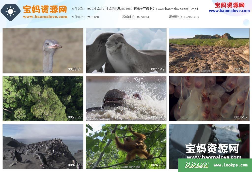 天天资源网收录的纪录片《生命 Life》,全部10集,国粤英三语发音,中文字幕;资源总大小约29.2G,单集播放时长约60分钟,1080P高清MP4视频格式,可以在电视机或电脑、平板、IPAD、早教机、手机等各种设备播放,提供百度云网盘下载。