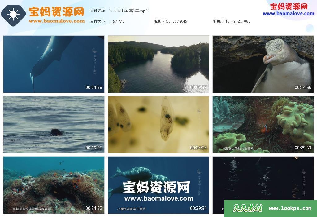 天天资源网收录的纪录片《大太平洋 Big Pacific》,全部5集,国语发音,中文字幕;资源总大小约6.21G,单集播放时长约50分钟,1080P高清MP4视频格式,可以在电视机或电脑、平板、IPAD、早教机、手机等各种设备播放,提供百度云网盘下载。