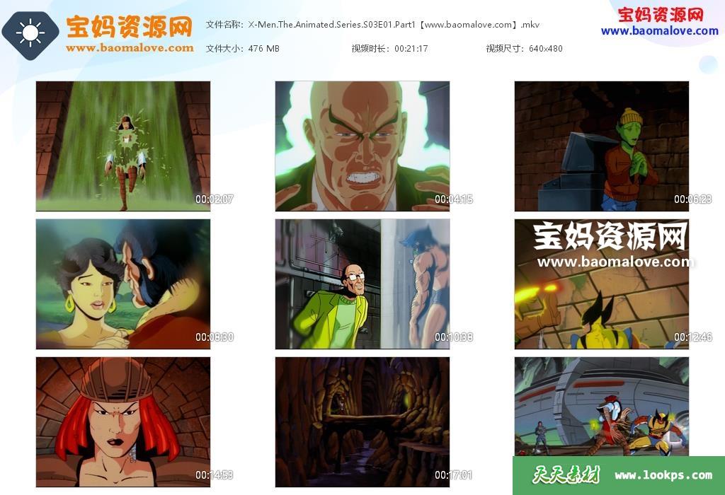 天天资源网收录的动画片《X-Men: The Animated Series》X战警英文版 第三季,全部19集,英语发音,内置英文字幕(内置多国语言字幕:西班牙文,葡萄牙文,可以下载后使用播放器设置字幕字体大小颜色或者切换关闭字幕);资源总大小8.8G,单集播放时长约21分钟,480P标清MKV视频格式,可以在电视机或电脑、平板、IPAD、早教机、手机等各种设备播放,提供百度网盘下载。