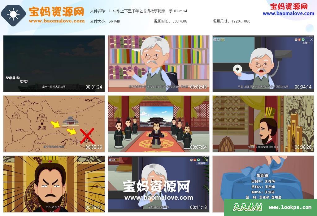 天天资源网收录的动画片《中华上下五千年之成语故事》第一季,全部40集,国语发音,中文字幕;资源总大小约2.05G,单集播放时长约14分钟,1080P高清MP4视频格式,可以在电视机或电脑、平板、IPAD、早教机、手机等各种设备播放,提供百度云网盘下载。