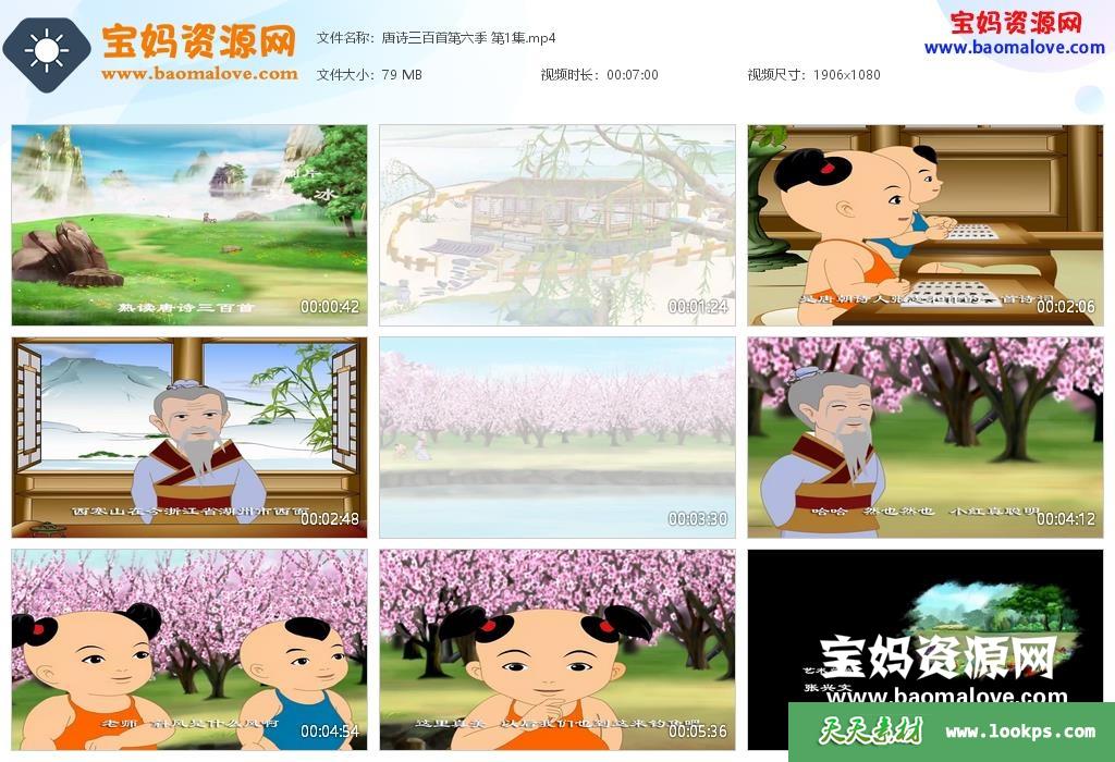 天天资源网收录的动画片《唐诗三百首》第六季,全部30集,国语发音,中文字幕;资源总大小约2.26G,单集播放时长约7分钟,1080P高清MP4视频格式,可以在电视机或电脑、平板、IPAD、早教机、手机等各种设备播放,提供百度云网盘下载。
