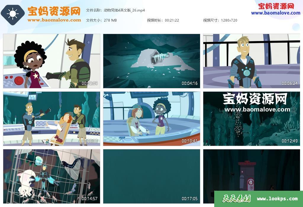 天天资源网收录的动画片《Wild Kratts》动物兄弟英文版 第四季,全部26集,英语发音,无字幕;资源总大小4.31G,单集播放时长约21分钟,720P高清MP4视频格式,可以在电视机或电脑、平板、IPAD、早教机、手机等各种设备播放,提供百度云网盘下载。