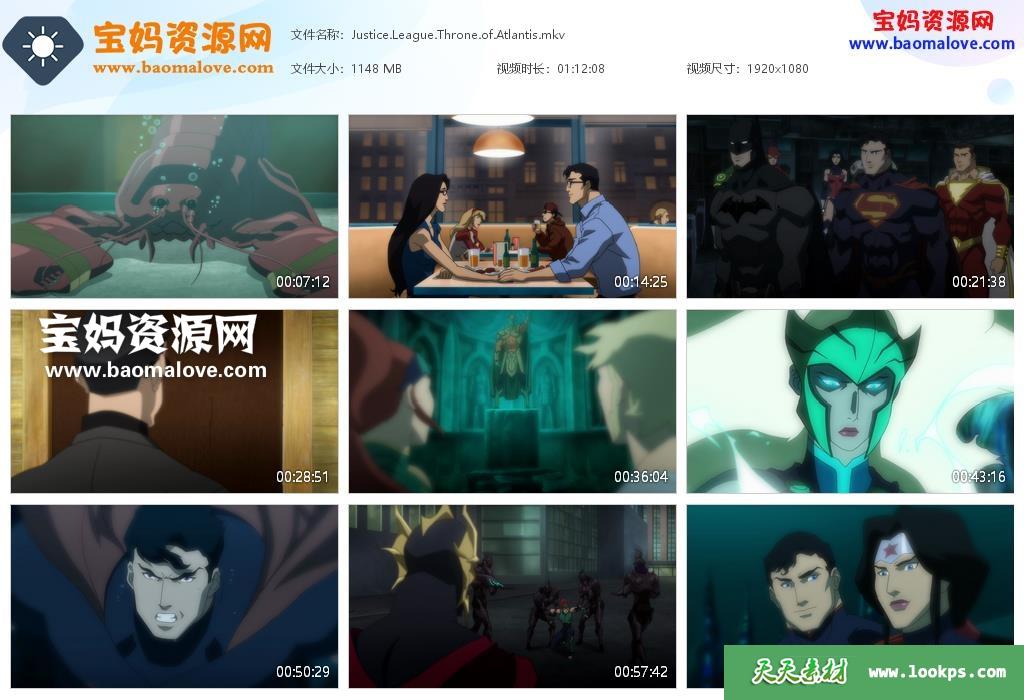 天天资源网收录的动画电影《正义联盟:亚特兰蒂斯的宝座 Justice League: Throne of Atlantis》,英语发音,内置英文字幕(可以下载后使用播放器设置字幕字体大小颜色或者切换关闭字幕);H265视频编码,资源大小约1.12G,1080P高清MKV视频格式,可以在电视机或电脑、平板、IPAD、早教机、手机等各种设备播放,提供百度云网盘下载。